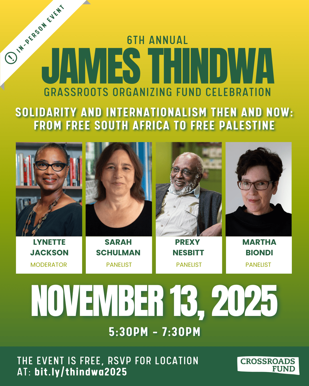 Join us in person for Solidarity and Internationalism Then and Now: From Free South Africa to Free Palestine at the 6th Annual James Thindwa Grassroots Organizing Fund Celebration on Thursday, November 13, 2025, at 5:30 PM on Chicago’s West Side. The event address will be shared with registered attendees only.